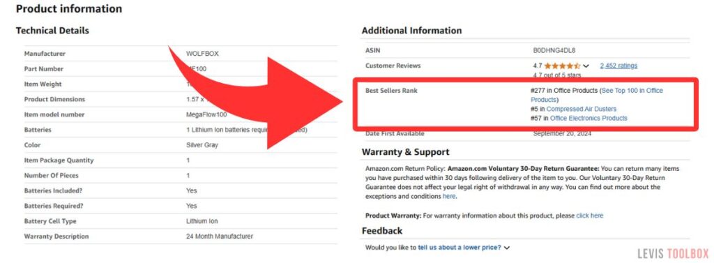 - BSR (Best Seller Rank): Shows how well a product sells within its category. The lower the BSR, the higher the sales in that specific category. BSR varies between categories. For example, a BSR of 2,000 in Home & Kitchen could outsell a BSR of 200 in Office Products. You can view any products BSR from the “Product Information” panel on the product details page.
