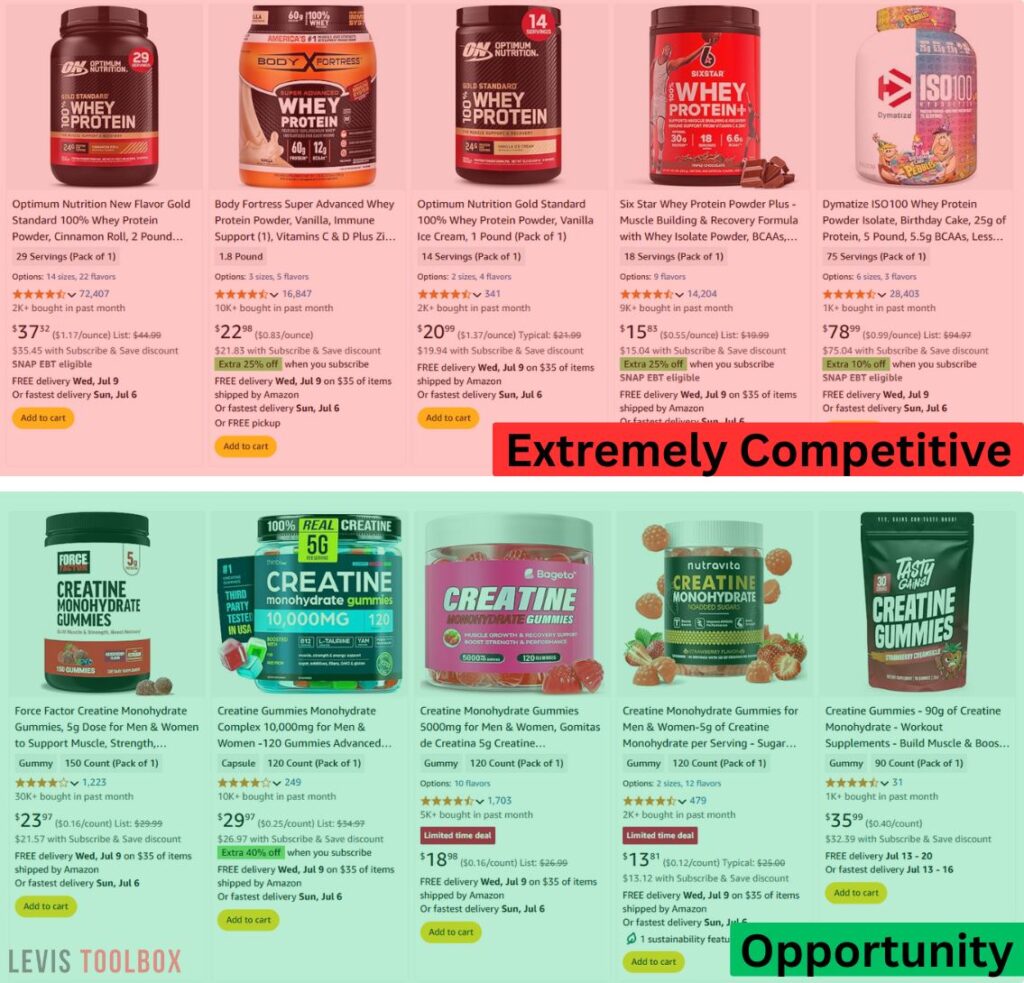 - Competition Level: How many other sellers offer similar products and how strong they are. Competing against big brands or listings with thousands of reviews is much harder.