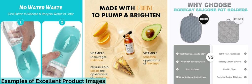 - Underutilizing image slots: This is an easy one to fix, but still needs to be stated. Amazon gives you nine slots for a reason; use them. Try to include a variety of image types like infographics, spec charts, size comparisons, lifestyle images, close-ups, and at least one image that shows someone using the product and looking into the camera. That image almost always boosts trust.